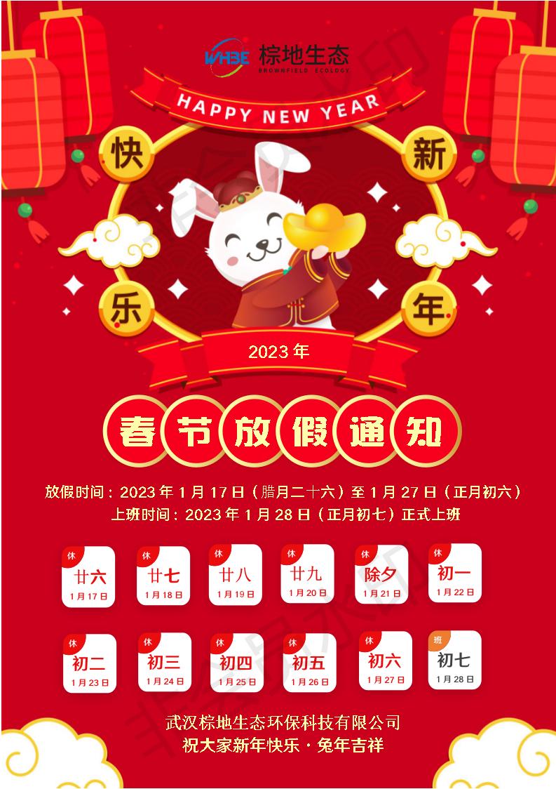 ? ? ? ? ?感謝您一直以來(lái)對(duì)我們工作的支持與理解,2023年新春將至,武漢棕地生態(tài)環(huán)保科技有限公司全體員工預(yù)祝大家新年快樂(lè),兔年吉祥。